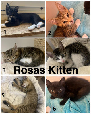 und Kokzidien nachgewiesen, wogegen sie behandelt wurden und nun gesund sind. Rosa zog zwischenzeitlich auf eine Pflegestelle, um sich von dem Stress ihrer Kitten zu erholen und auf ihre