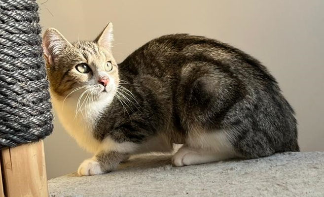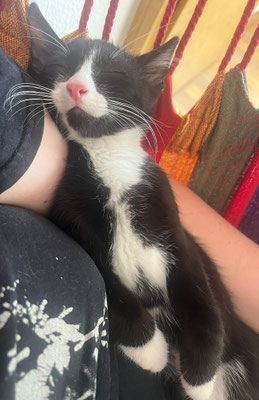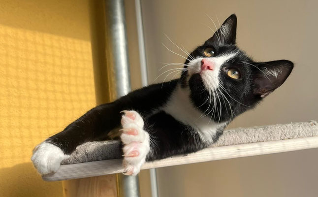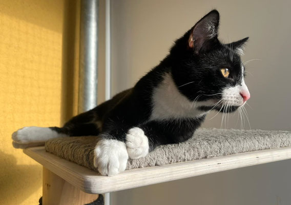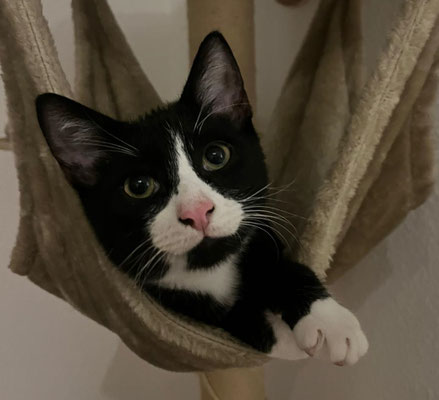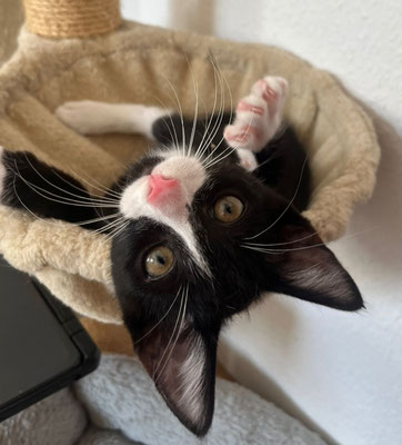 Der kleine Kletterkünstler wurde allein auf einem Baum gefunden – wie er da hochkam, bleibt sein Geheimnis. Anfangs war er schüchtern, doch durch den Kontakt zu anderen Kitten hat er schnell