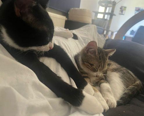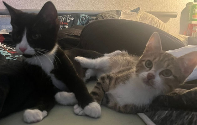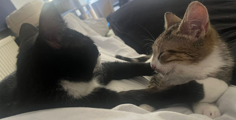 Kalani (getigert-weiß) und Angel (schwarz-weiß) leben seit kurzem zusammen auf einer Pflegestelle – und schon nach wenigen Tagen war klar: Die beiden sind wie füreinander gemacht. Sie toben, raufen und spielen ausgelassen miteinander, ruhen sich anschließend Seite an Seite aus und genießen die Nähe zueinander.