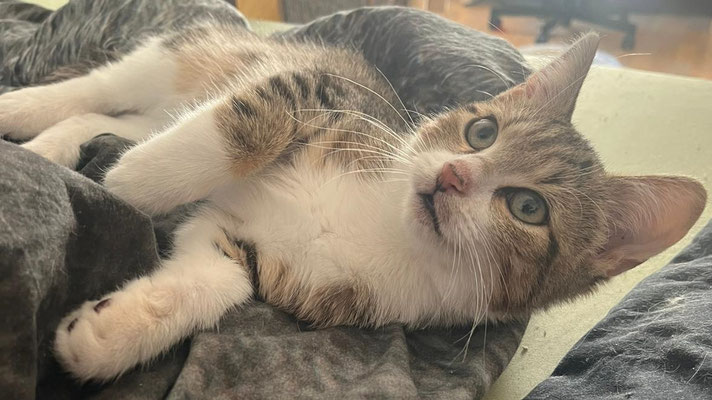 Angel kam während eines Gewittersturms zu uns – allein, krank und völlig erschöpft. Nach erfolgreicher Behandlung hat er sich zu einem energiegeladenen, lebensfrohen Kater entwickelt. Er liebt