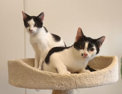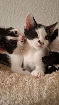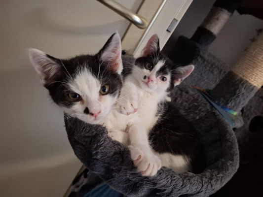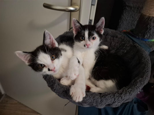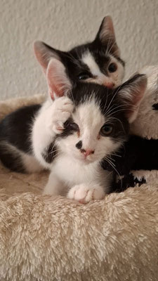 Die beiden sind Flaschenkittentypisch extrem anhänglich und liegen oftmals mehr auf Menschen als auf Kuschelbetten. Sie mögen eigentlich so gut wie jeden und schnurren sogar beim Tierarzt. Die Jungs sind außerdem sehr verspielt und jagen sich gegenseitig, sowie ihre Ziehgeschwister (T-Wurf) gerne durch die ganze Wohnung. Sie sind außerdem unzertrennlich - liegen immer beieinander, putzen sich gegenseitig und sind füreinander da wenn einer mal krank ist. Deshalb werden sie ausschließlich gemeinsam vermittelt.